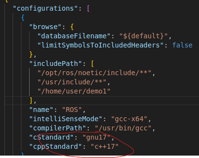首先在.vscode文件夹下的c_cpp_properties.json文件修改成下图:
